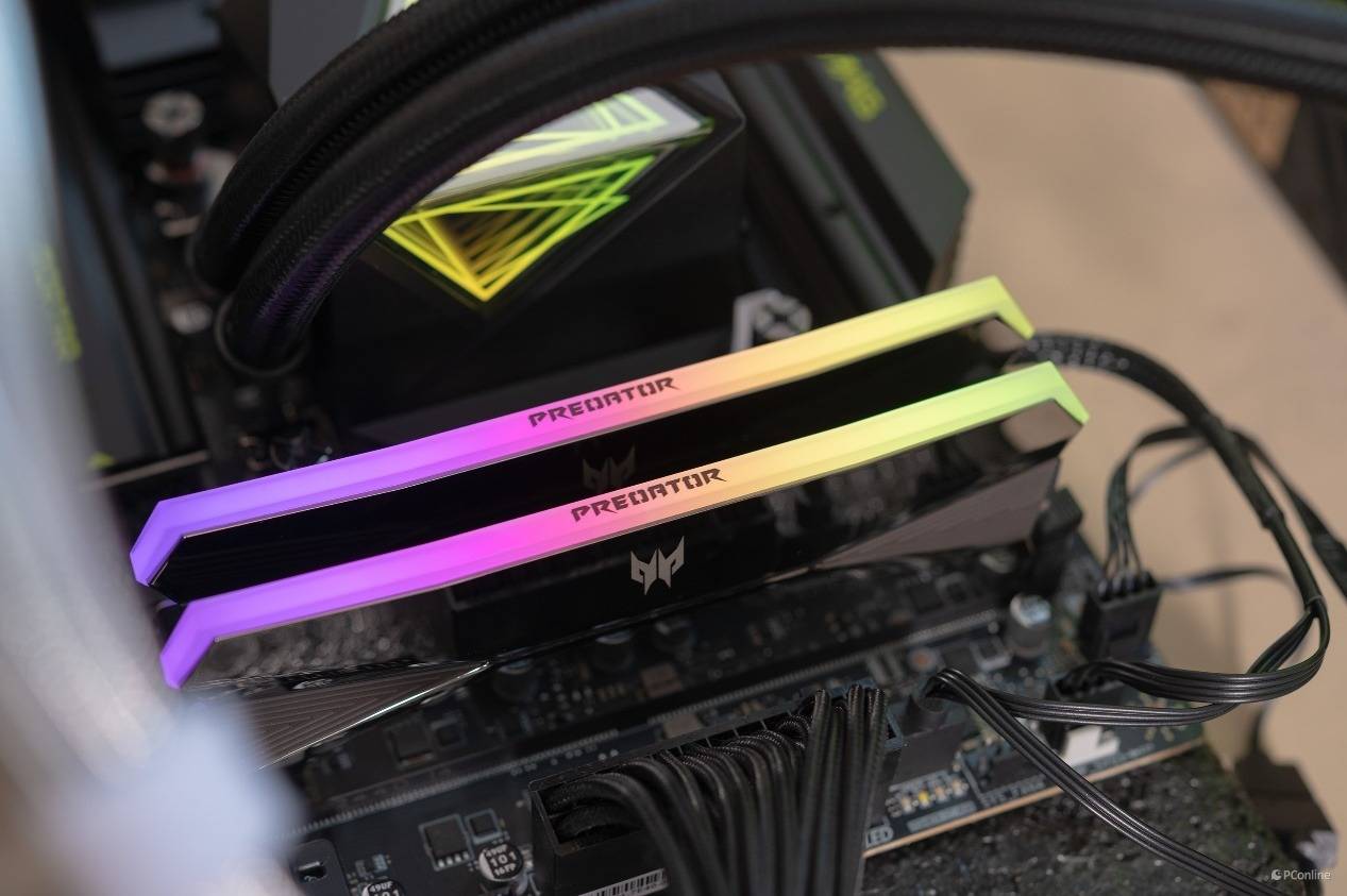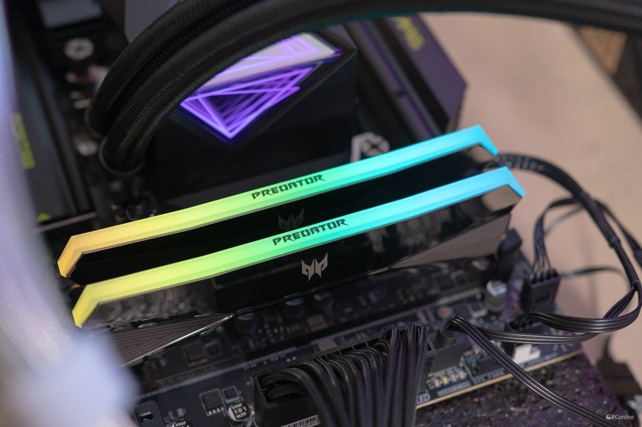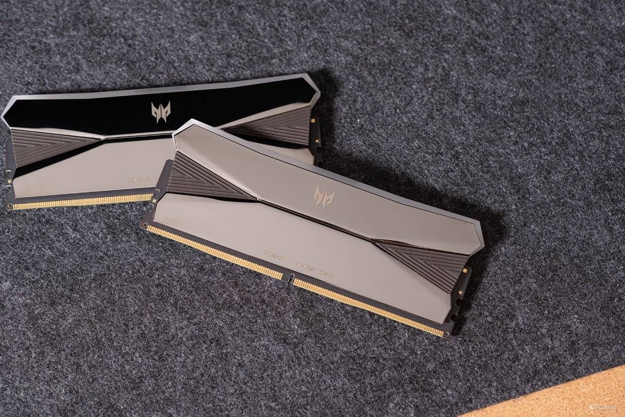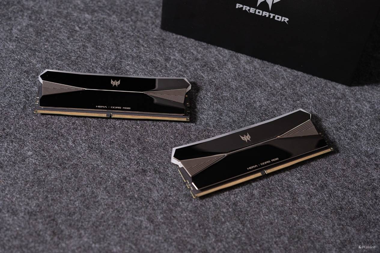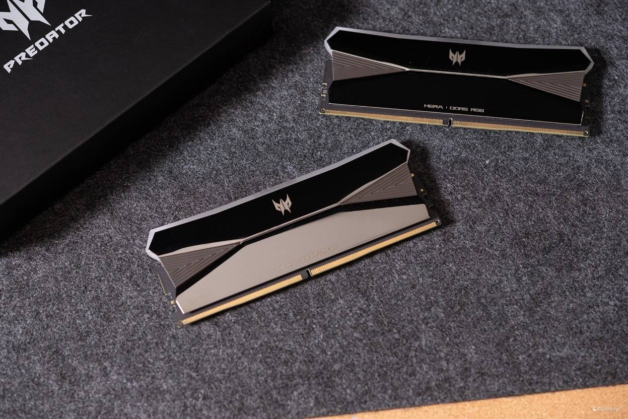 接着我们使用AIDA64软件中自带的缓存与内存测试,检测内存在主板上的读写速度和延迟表现。这里给大家介绍一下本次测试用到的内存是宏碁掠夺者 HERA影锋DDR5内存,并且我们上手的还是电镀镜面的版本,质感十足。