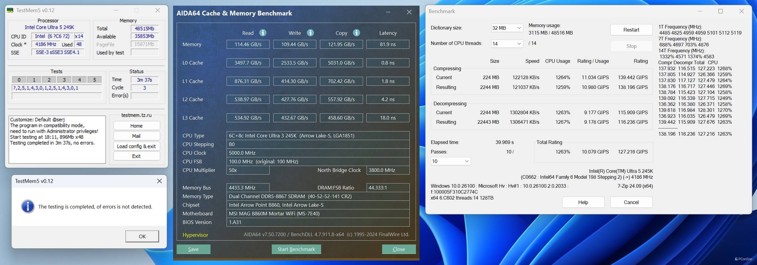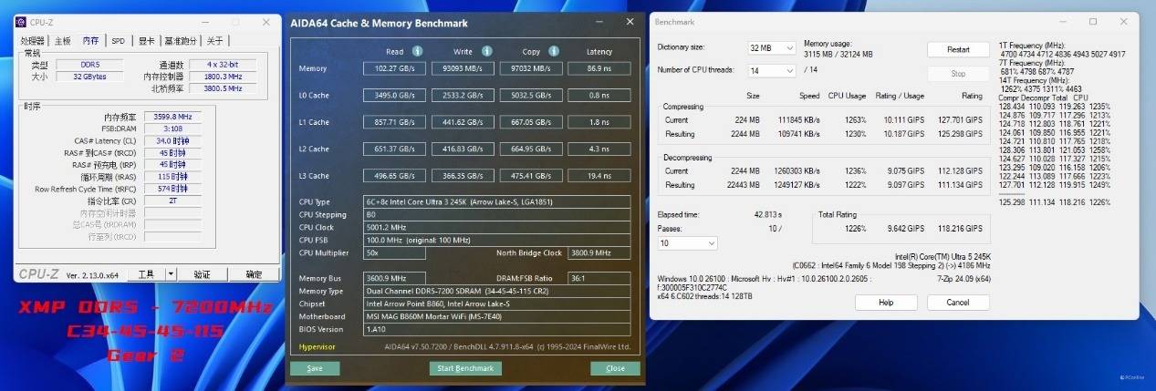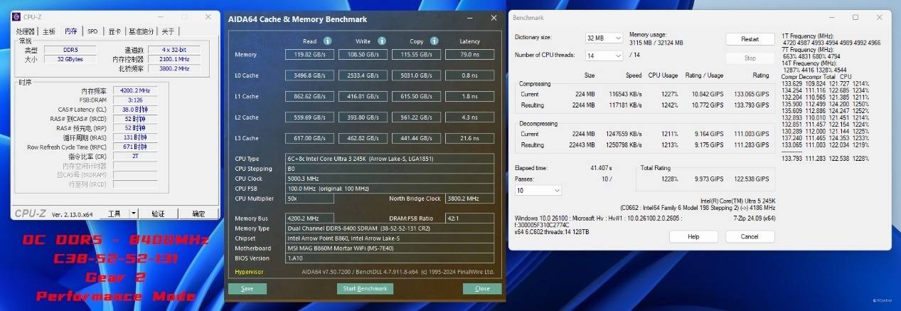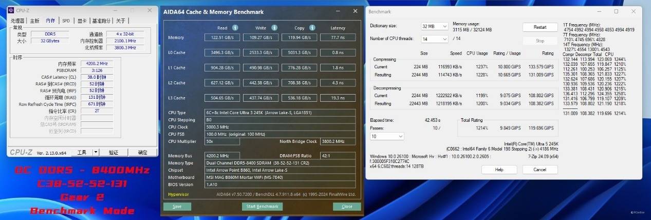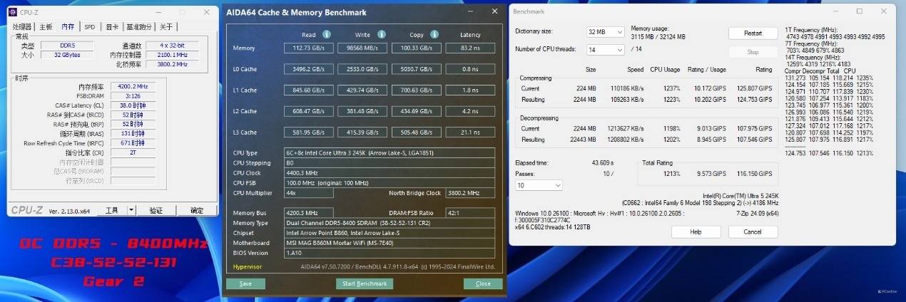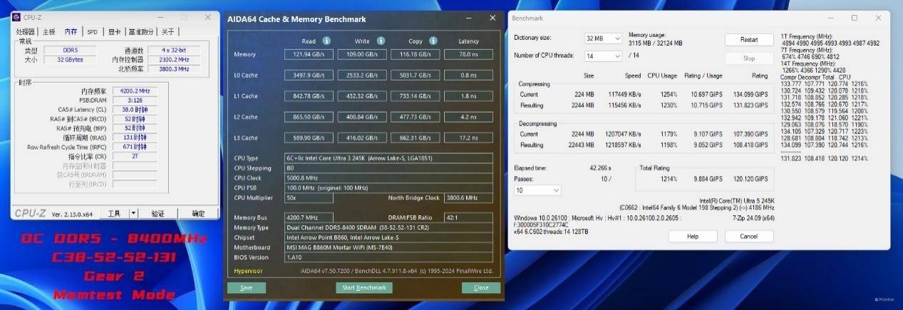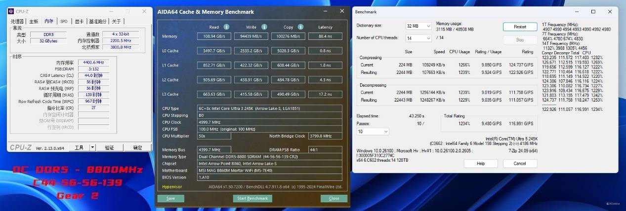 于是我们试着更换一对CUDIMM内存进行进一步的内存超频测试,内存频率已经达到了DDR5-8867 C40-52-52-141 Gear2,读取、写入、复制成绩分别为114.46 GB/s、109.44 MB/s、121.95 GB/s,延迟也仅为81.9ns。同时这里我们是已经开启了Memory Extension Mode:Memtest Mode,并且通过了7-ZIP稳定性、TM稳定性测试的,似乎日常使用也是相当不错。