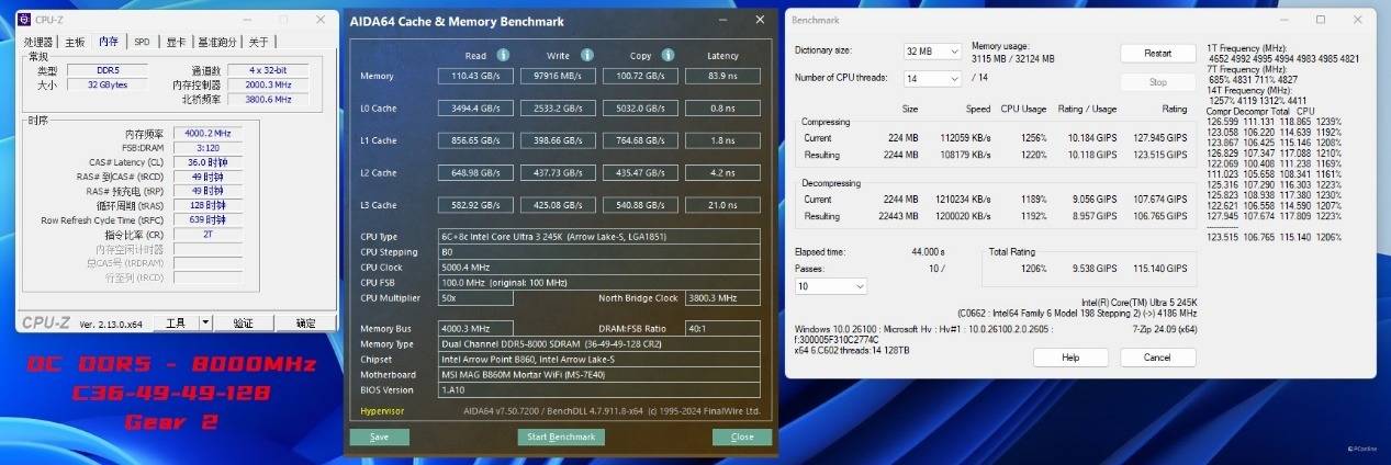 接着我们简单超频一下,之前在13代或14代平台上,想要超频8000MHz已经是一大难题了,而如今使用酷睿Ultra 5-245K+微星B860M迫击炮,上8000MHz就像喝水一样简单。此时内存读取为110.43 GB/s,写入97916 MB/s,复制100.72 GB/s。