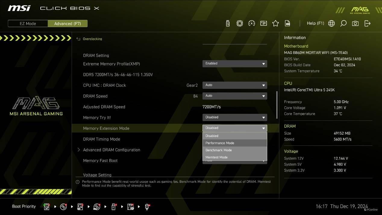 除此之外,微星还给内存开发了Memory Extension Mode功能,说简单一点就是能够针对性的调节内存的小参,使内存的性能更进一步。该模式包含Performance Mode、Benchmark Mode以及Memtest Mode。