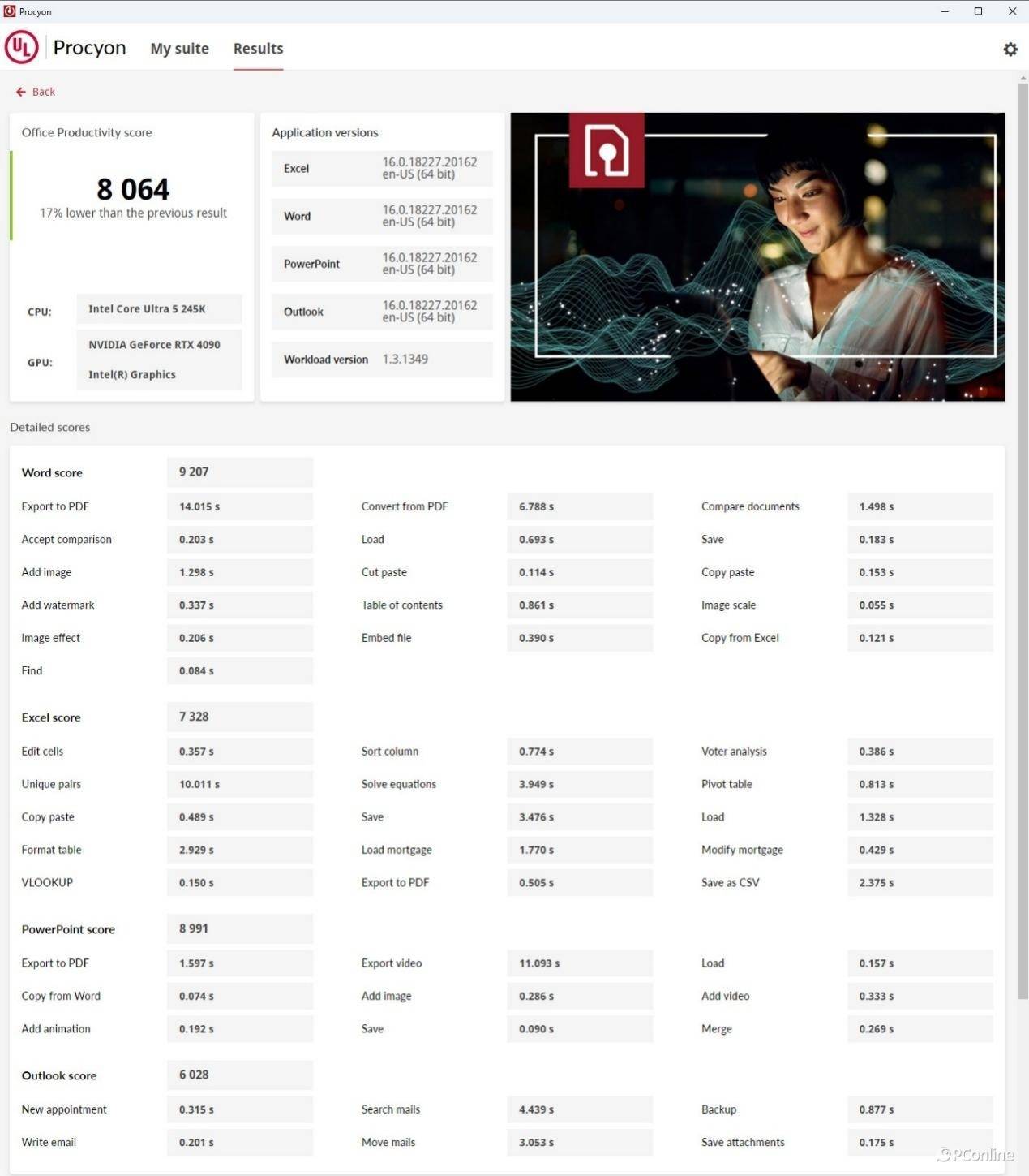 首先看到的是办公软件的测试,实测总分8064分,子项目得分分别是Word 9207分、Excel 7328分、PowerPoint 8991分以及Outlook 6028分,整体表现可圈可点。