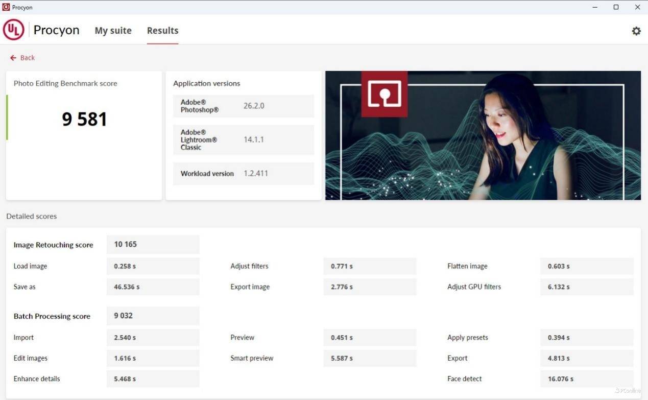第二项是图像编辑测试,这个项目会用到PS以及LR这种比较吃CPU性能的软件,酷睿Ultra 5-245K配微星B860M迫击炮主板可以说是丝般顺滑,完全能够释放应有的性能,实测得分9581。
