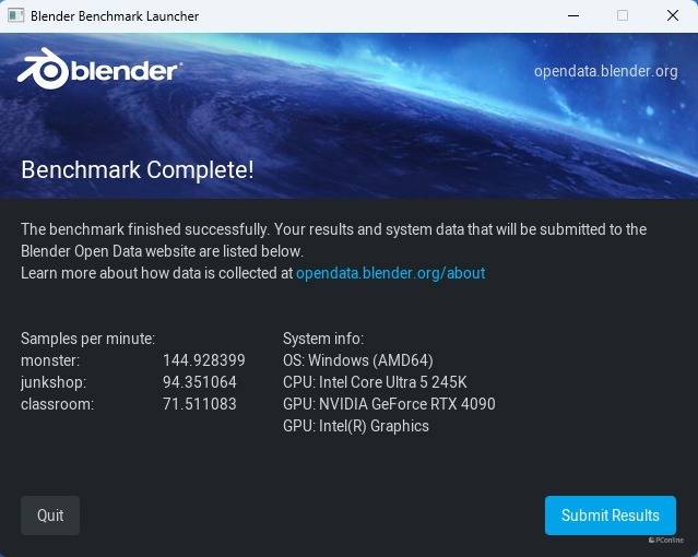 渲染目前也是不少用户的创作工作之一,这里我们用Blender进行测试,实测酷睿Ultra 5-245K的得分如下:monster 144.928399;junkshop 94.351064;classroom 71.511083。