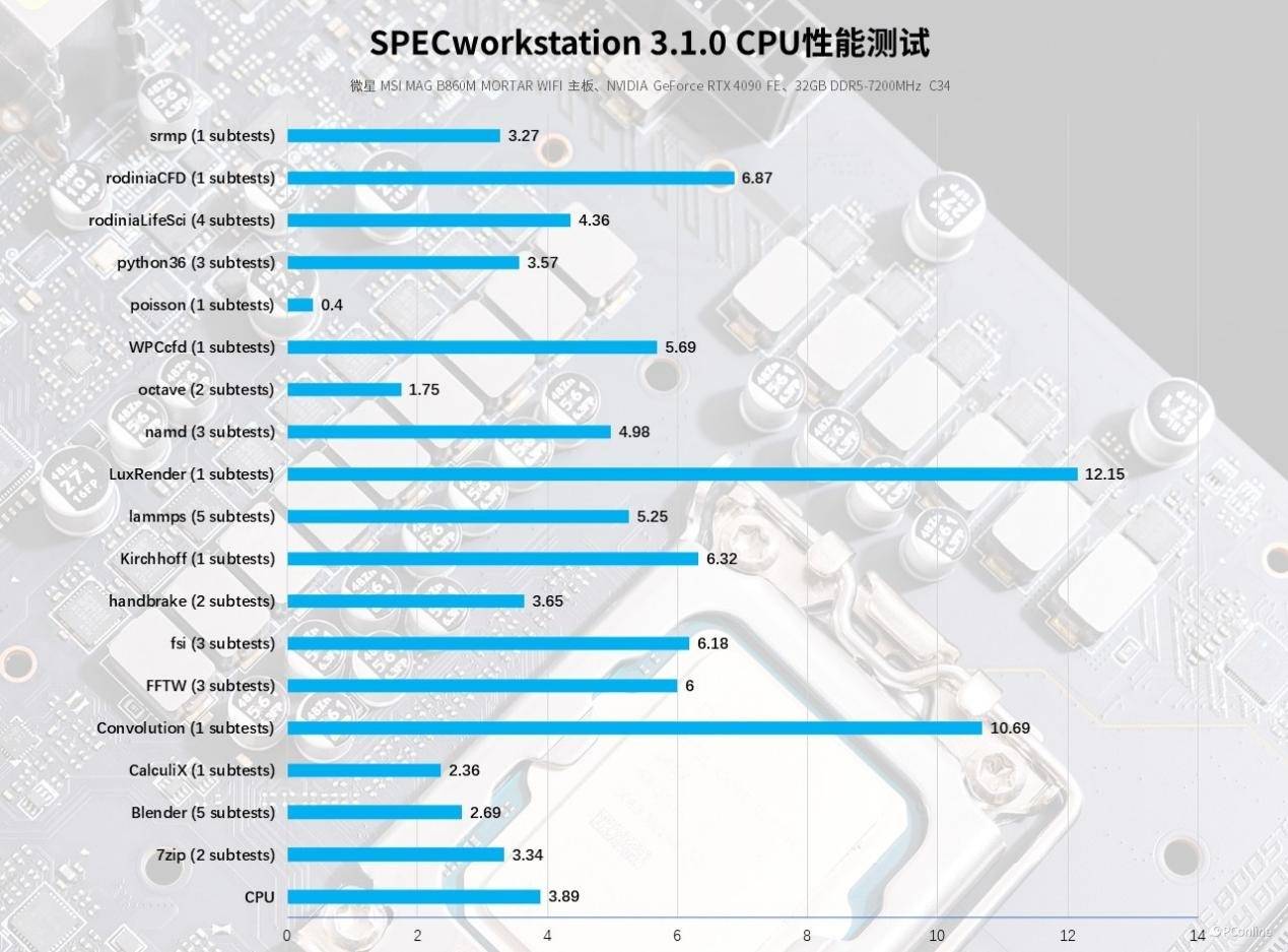 最后是SPECworkstation,这程序是针对生产力工作站电脑的测试工具,也就是所谓的工业领域。综合来看,酷睿Ultra 5-245K得益于更先进的微架构设计,在SPECworkstation中的性能表现总体要比前代要强3%左右,表现也算不错了。