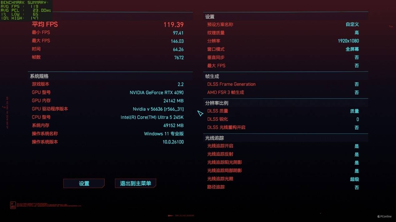 至于压力比较大的《赛博朋克2077》,酷睿Ultra 5-245K也丝毫不输,超级光追加持下,帧数也能跑到接近120 FPS,可以说微星B860M迫击炮的这套平台完全算得上是性能小钢炮了。