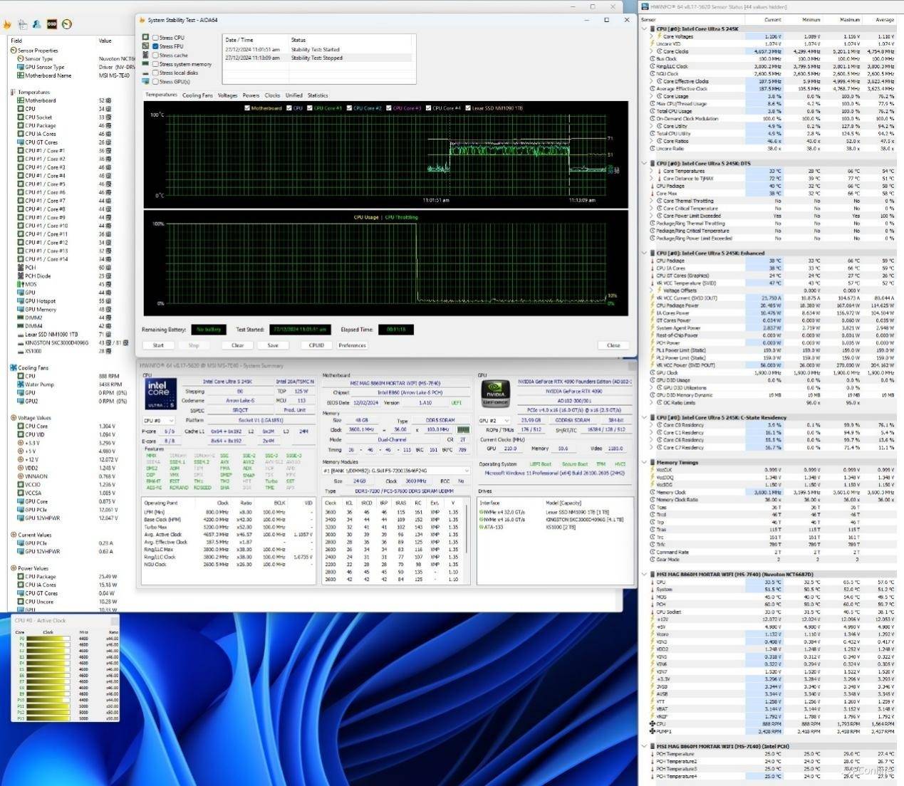测试平台方面,我们这次使用的是Intel酷睿Ultra 5-245K处理器,搭配NVIDIA GeForce RTX 4090,选用如此高端的显卡也是为了能够尽可能的让处理器不要有瓶颈,这样才能更好的展示这款主板的潜力所在。内存方面,我们用的则是32GB的DDR5-7200MHz C34套装,为普通的DDR5内存版本,并非最新的CUDIMM内存,之所以用这款内存是因为目前普通DDR5内存的价格比较便宜,搭配新的平台,想要突破8000MHz轻轻松松,对比13代、14代时期要简单得多。