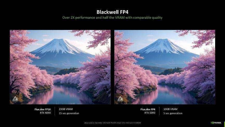 根据NVIDIA的实测,采用FP 4精度去生成同一张图片时,不仅生成速度更快,同时显存占用也更少,相较于传统的FP 16精度,FP 4精度最多可以实现2倍以上的性能提升,以及节省50%的显存消耗。