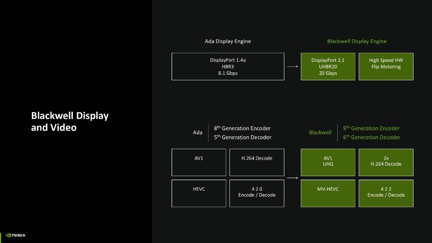 另外Blackwell架构也终于能够实现4:2:2色度取样的视频编解码,相较于4:2:0来说,它能够纪录更多的色彩信息,提升画面品质。同时显示输出引擎也同步升级至 DisplayPort 2.1 UHBR20,单一通道可实现20Gbps的带宽,单一线材具备4通道即可达80Gbps的能力。