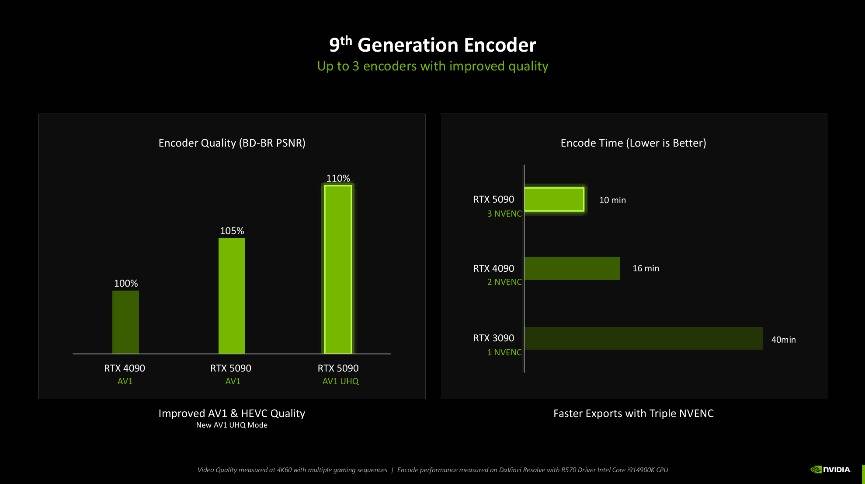 同时,Blackwell架构中RTX 5090配备了三个第九代编码器,编码效率相比上代显卡也是史诗级进步,能够大大提升创作者的效率。