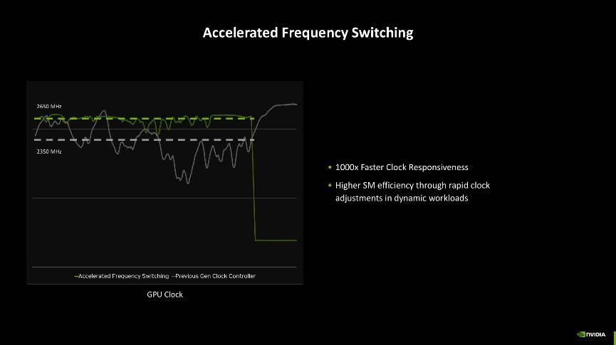 另一种省电的方法是Blackwell的频率切换速度比Ada架构时提高了上千倍,即便是进入低电源状态的睡眠、唤醒速度也提高了数个量级。得益于上面这些特性,现在Blackwell GPU效能更好,可更早完成工作负载并进入低功耗状态,而在有负载时,凭借更快的频率切换速度也能更快的提升性能释放,同时也可以针对性的供电,让一些不活跃的核心也能维持在低功耗状态,从而实现更有效的电源利用。根据NVIDIA的介绍,这样至少能够节约50%的电源消耗。