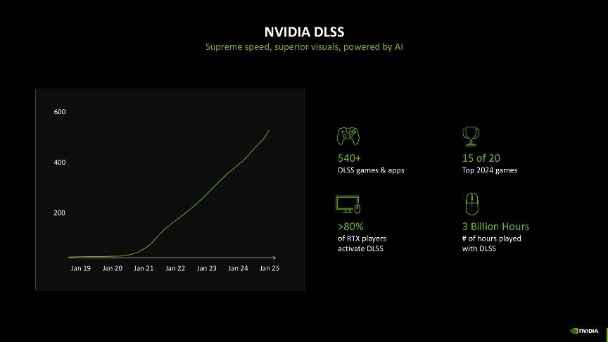 介绍完NVIDIA引以为傲的RTX神经渲染,再让我们看看应用RTX神经渲染的最好例子——DLSS。它不仅能提高帧率,还可同时提供清晰锐利的高质量图像,效果与原生分辨率渲染媲美。目前支持DLSS的游戏已经多达540款,而玩家使用DLSS的时间更是长达3亿个小时,可以说DLSS给玩家带来了划时代的游戏体验。