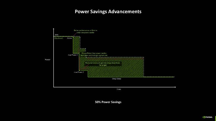 首先是闲置运算单元的部分,NVIDIA为Blackwell开发了新的电源控制模式——Rail Gating,简单来说就是可以单独微调显卡内部不活跃部件的供电情况,即如果你的存储暂时没用,或者你的部分核心暂时没用,则可以通过调整这部分的电源供应,实现节能的效果。