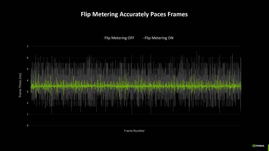 另外,由于多帧生成技术,为了防止画面效果变差,NVIDIA还引入了专属的Flip Metering来代替CPU Pacing,它将帧节奏逻辑转移到显示引擎,让GPU能够更精确地管理显示时间,尽可能的将每一帧画面的生成时间保持一致,从而提高整体游戏视觉的流畅感。