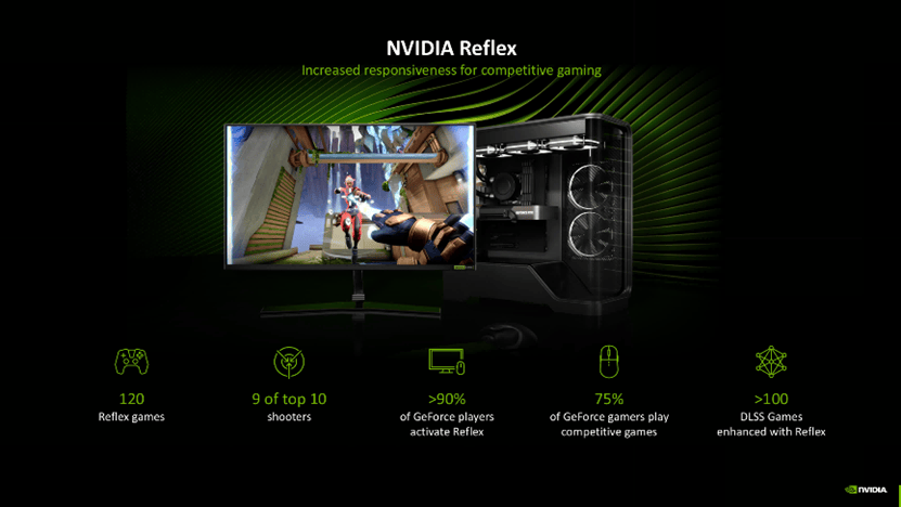 为了尽可能的降低延迟所带来的不良游戏体验,NVIDIA发布了NVIDIA Reflex技术,它可以使GPU和CPU同步,确保最佳响应速度和低系统延迟。