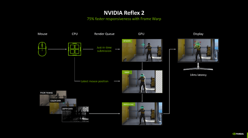 NVIDIA Reflex技术已经足够厉害了,不过新一代降低游戏延迟的技术NVIDIA Reflex 2还有黑科技!Reflex 2将Reflex低延迟模式与新的Frame Warp技术相结合。在GPU渲染当前帧的同时,CPU会根据最新的或控制器输入计算出下一帧的相机位置。Frame Warp技术会在GPU渲染的帧即将发送到显示器之前,尽可能晚地对其进行采样,并根据CPU计算出的新相机位置对该帧进行扭曲调整,从而将最新的玩家输入反映到屏幕上,延迟最高可降低75%!