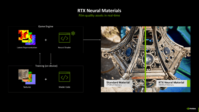 过去复杂的物品或大量异材质的贴图往往会占用相当大的内存空间。然而,得益于神经网络渲染技术中的RTX Neural Materials材质功能,这一问题得到了显著改善。RTX Neural Materials通过在游戏引擎端结合Latent Representation和Neural Shader,显著降低了实际生成的材质数据量,从而在占用更少显示内存的同时,实现了细节更丰富的材质表现,达到了实时生成如电影般细腻素材的效果。