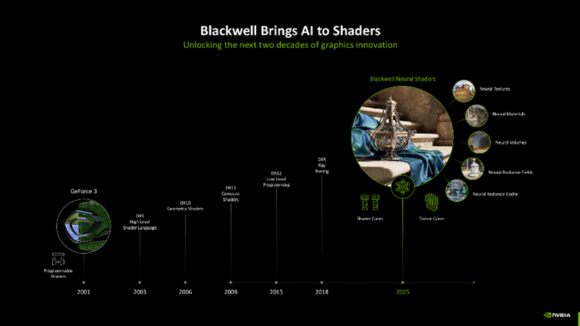 自2001年NVIDIA推出首款GeForce 3显卡以来,随着显示API(Direct X)的不断更新,着色技术也不断发展,不断加入更高阶API的支持以及光线追踪功能,不过,随着Blackwell架构的出现,一切都迎来了重大变革, Blackwell将Shader Core和Tensor Core进行了整合,开创性的引入了神经网络渲染器。