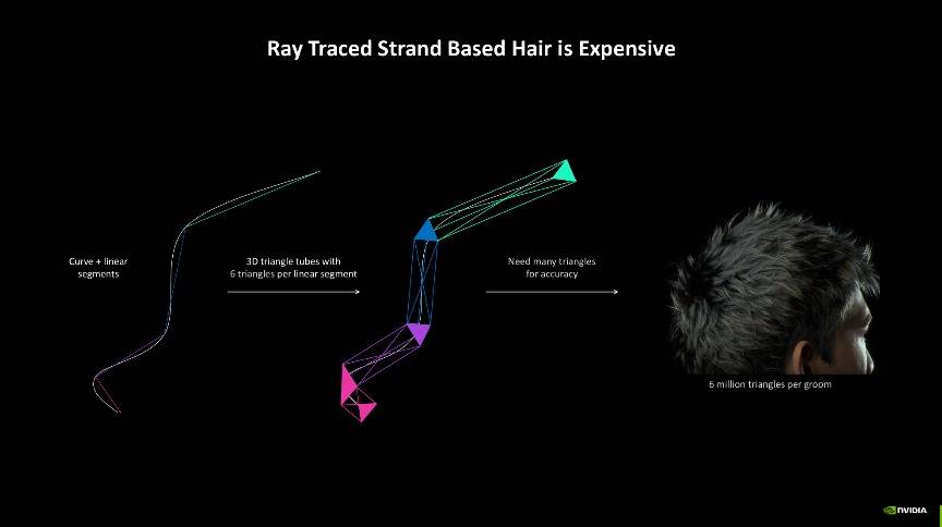 除了人脸渲染外,头发渲染也一直是传统电脑图形学中的难题,因为每根头发都需要大量的多边形来构建,例如一位男士的头发可能需要多达400万个三角形,再加上光线追踪技术,画面所需要的运算负载极大。NVIDIA则通过Linear - Swept Spheres(线性扫描球体)技术有效减少了渲染头发所需的几何体数量,以球形代替多边形,更贴合头发的形状,从而将内存占用量大幅缩减至三分之一,并进一步提升了实际帧数,让头发的渲染效果更加自然流畅。