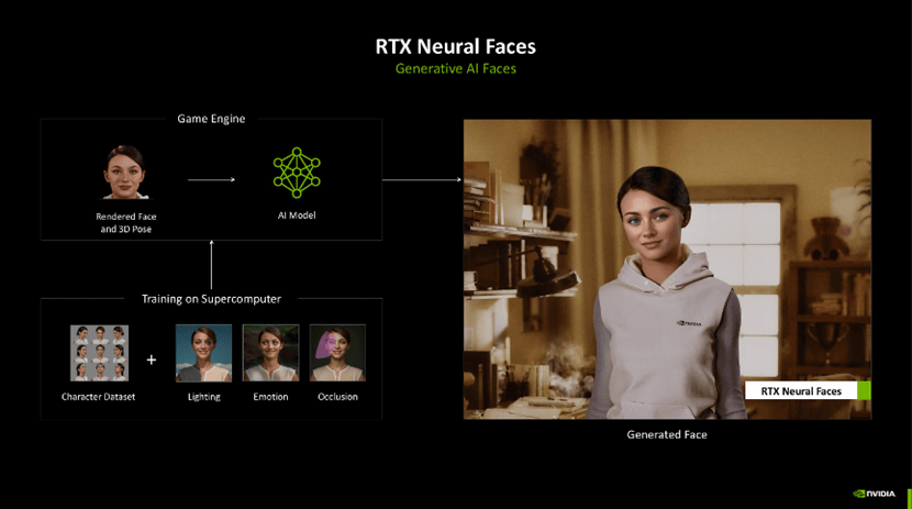 人像也是神经网络渲染的重点之一。传统的人脸渲染方式与现实之间存在一些细微的偏差,这些偏差累积起来很容易让角色不够真实,总有种AI的感觉。而 RTX Neural Faces 可以通过 AI 计算结合 3D 姿态数据,生成更自然的面部表情和动作,特别是在角色互动和剧情表现上,彻底打破了传统渲染技术的限制。