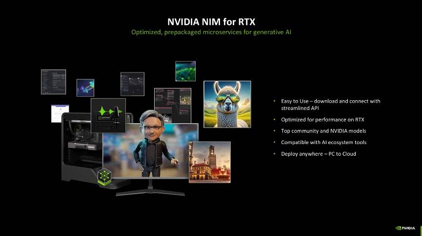 此外,NIM for RTX提供了业界标准的API,使得开发者可以利用这些API轻松地集成和扩展AI功能。平台还包含了领域特定的代码,这些代码针对特定AI领域进行了优化,以提高模型的准确性和效率。NIM for RTX还支持定制化,允许开发者根据自己的需求调整和优化模型。