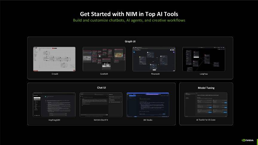 同时,RTX NIM还可以与各种顶级AI工具相配合使用,用户构建和定制聊天机器人、AI代理和创意工作流程将变得更加容易。同时玩家还可以通过图形用户界面(Graph UI)和聊天用户界面(Chat UI)与AI进行互动,利用模型调优工具来优化AI模型的性能,整体可玩性更高,也展示了RTX NIM平台的丰富性。