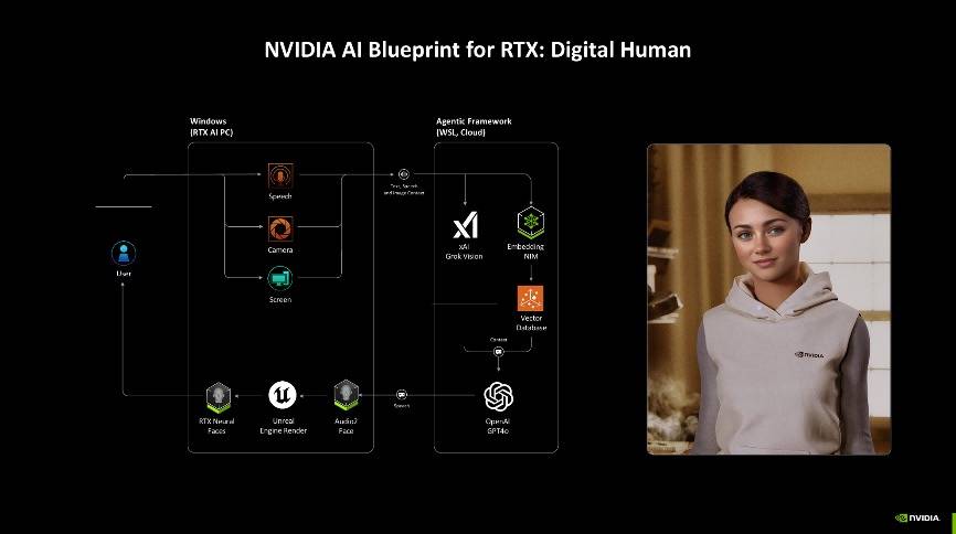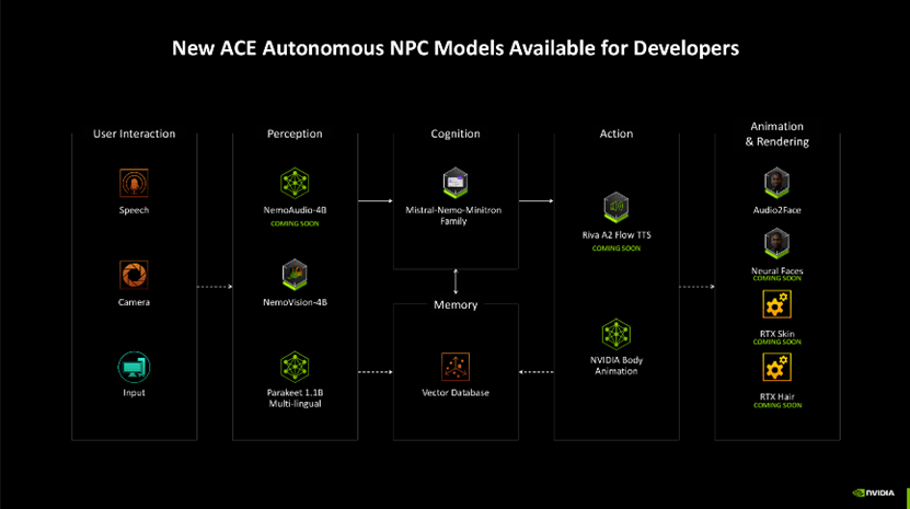RTX NIM在游戏领域的应用也尤为引人注目。通过 NVIDIA 的 ACE(AI Co-playable Characters)技术,游戏开发者可以为游戏中的 NPC(非玩家角色)赋予更人性化、更具互动性的设计。