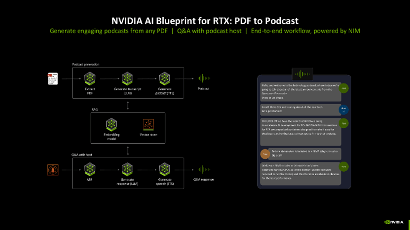 NVIDIA也展示了一些可用的场景,例如NIM可以将静态的PDF文档转化为动态的播客内容。用户可以实现从PDF中提取文本、生成转录本、生成播客以及通过问答环节与播客主持人互动。这样不仅提高了内容的可访问性和吸引力,还为内容创作者提供了一种新的内容创作和分发方式,知识和信息的传播更加广泛和有效。