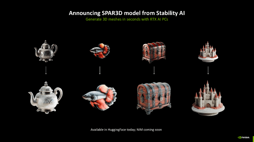 其次,Stability AI宣布了其SPAR3D模型,该模型能够利用RTX AI PC在几秒钟内从单张图像生成3D物体的完整结构并且可以实时编辑。
