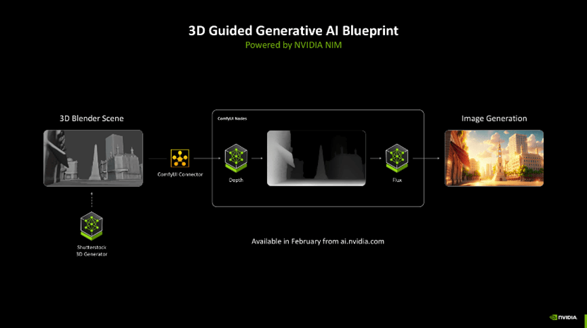 在创意创作领域,NVIDIA在生成式AI领域取得了显著进展,尤其是在3D工作流程的加速上。例如NVIDIA NIM带来了不少创新功能,未来Blender已经可以与Comfy UI相结合,利用AI技术将3D场景转化为逼真的图像,这一创新将大大提升设计师的工作效率,另外对普通用户也十分友好,你无需懂得详尽的软件操作方式,也能生成逼真的场景。