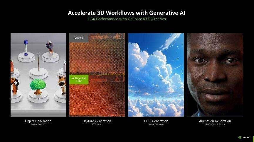 性能方面,NVIDIA也强调了,如果你使用的是GeForce RTX 50系列,生成式AI加速3D工作流程最高能够提高1.5倍的性能,显著提升创意工作者的生产效率。