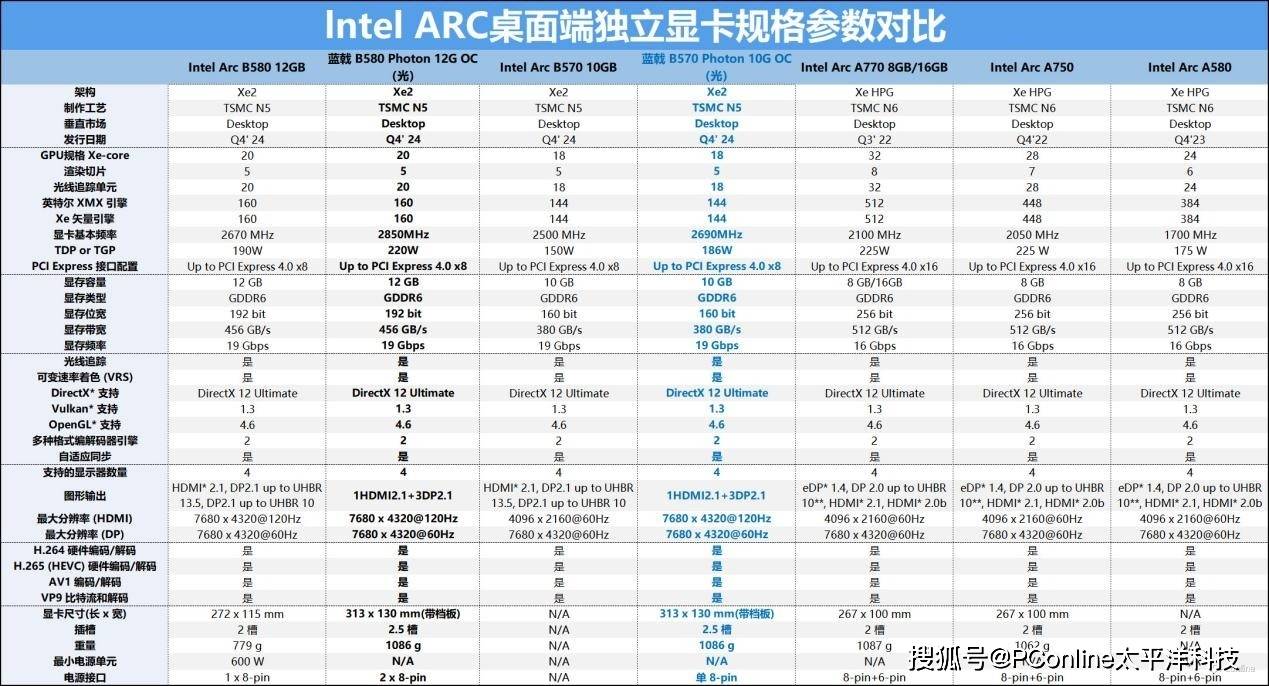 值得注意的是,Intel Arc B570并没有提供公版显卡,而是完全开放给AIB合作伙伴进行个性化优化。因此,我们看到GUNNIR Intel Arc B570 Photon 10G W显卡的规格明显高于Intel官方公布的Intel Arc B570标准。