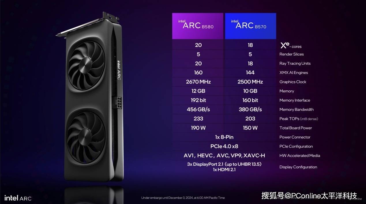 然而,Intel Arc B570在核心规格和显存规格上有所调整。该型号搭载了18个Xe核心、18个光线追踪单元、144个XMX AI引擎、核心频率为2500MHz、10GB显存、160 bit显存带宽、单8Pin供电、原生支持AV1解码和编码、配备了3个DP2.1接口、PCIe 4.0 x8物理接口、具有150W TBP以及203 TOPs的算力(int8)。