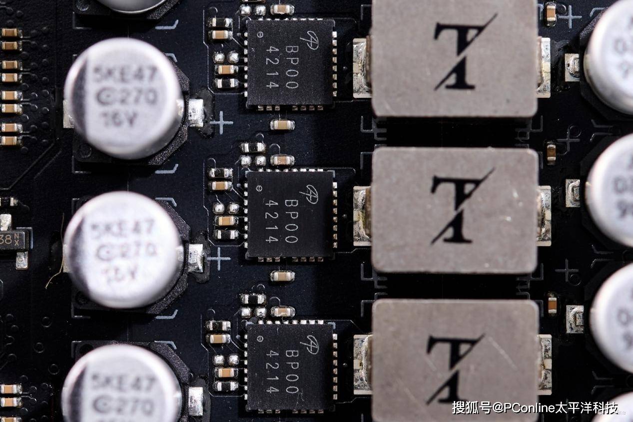 而每相核心供电还配上了钰邦固态电容,Tide定制电感,以及DrMos芯片。其中DrMos芯片来自万国半导体 AOS出品的AOZ5517QI,丝刷编码:BP00,单颗最大可持续输出电流为60A。