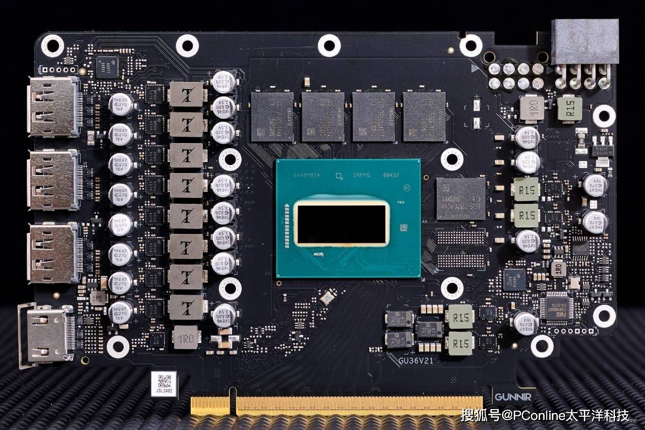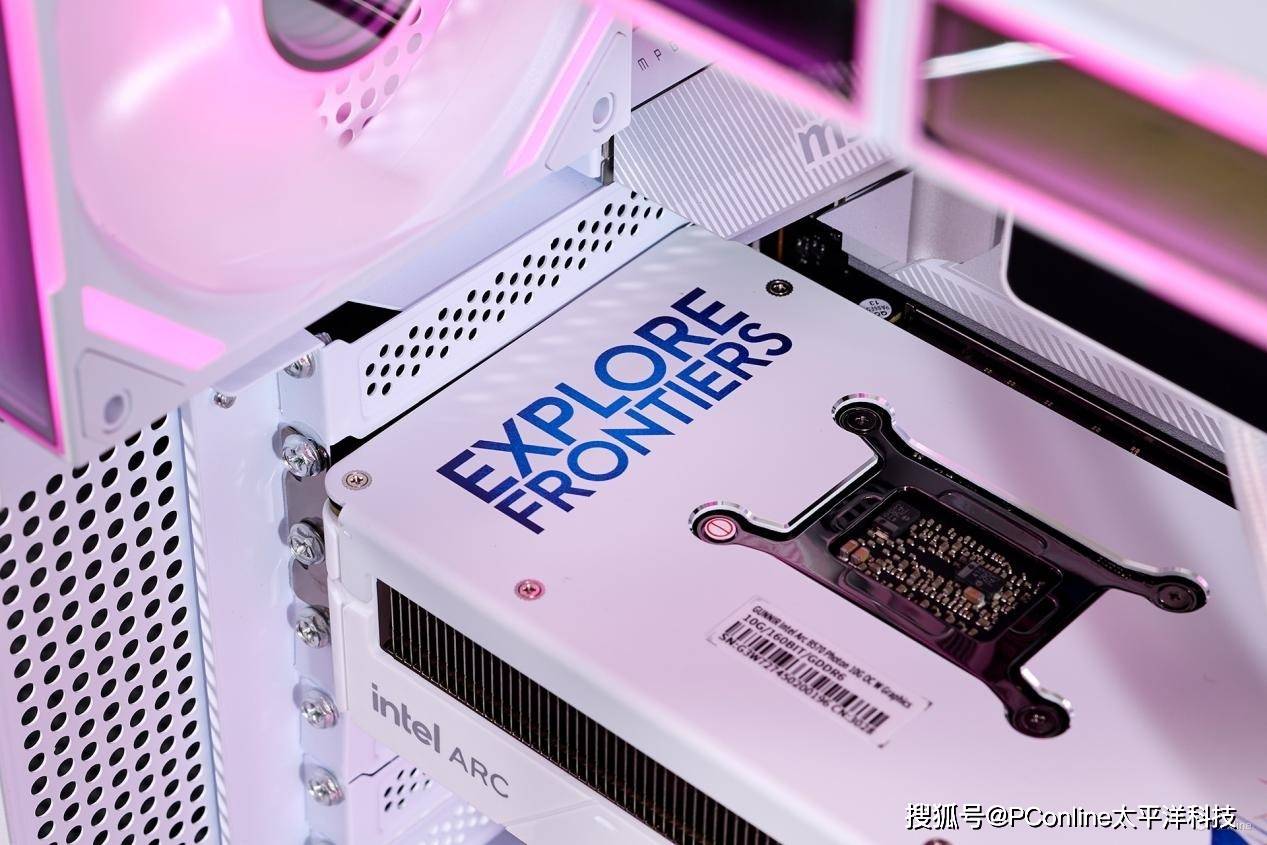 显卡顶端的“Intel ARC”标志,伴随着“EXPLORE FRONTIERS”(探索边界)的口号,彰显了GUNNIR作为Intel显卡在国内的首家核心合作伙伴,共同致力于探索GPU领域的未来。