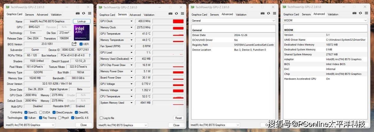 驱动方面,我们首先使用了GUNNIR蓝戟提供的专门针对Arc B570显卡的Beta版本驱动:GFX_WIN_101.6449_101.6256。同时大家可发现最新版本的GPU-Z 2.6.1.0版本即可正确识别出GUNNIR Intel Arc B570 Photon 10G W显卡各参数。
