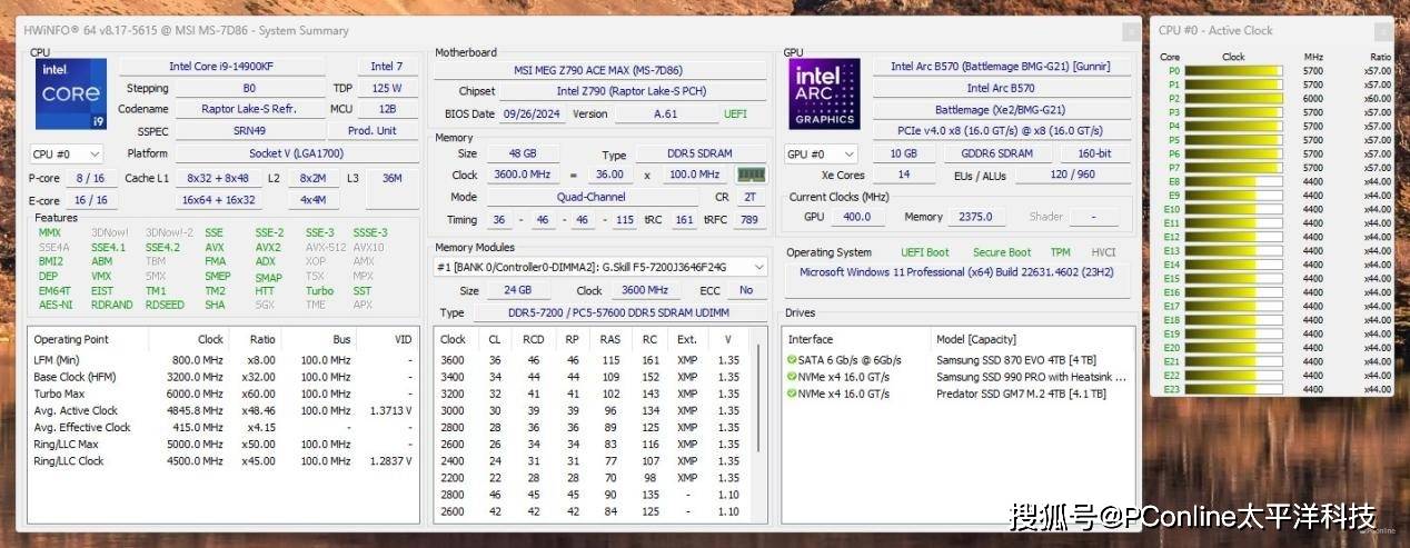 在进行上机测试之前,我们有必要介绍一下本次测试所采用的硬件平台。测试中使用的处理器是Intel Core i9-14900KF,与之搭档的主板是微星MSI MEG Z790 ACE MAX战神主板。为了充分发挥性能,我们选用了芝奇Trident Z5 Royal DDR5-7200 C36 48GB内存套装。在供电方面,我们配备了微星MEG Ai1300P PCIE5战神全模组白金牌电源,通过单条8Pin显卡模组线为显卡进行供电。