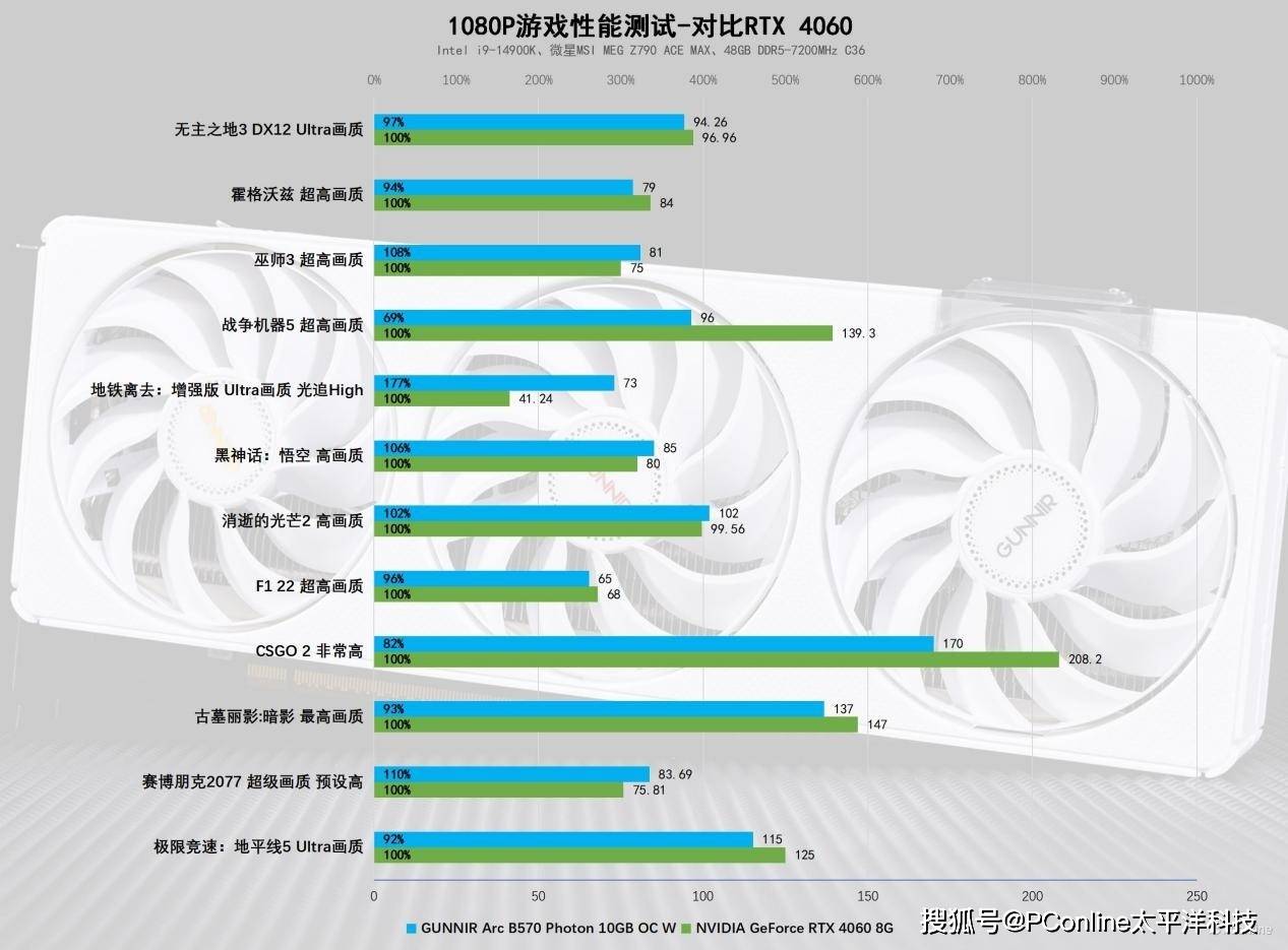 在游戏性能的评估中,我们专注于1080p分辨率下的表现。经过对12款游戏的测试,GUNNIR Intel Arc B570 Photon 10G W显卡与RTX 4060的性能不相上下。这表明,在性能相近的情况下,定位更具优势、热量和供电需求更低的显卡将占据同档次产品中最高的性价比。因此,GUNNIR Intel Arc B570 Photon 10G W显卡似乎成为最佳选择。