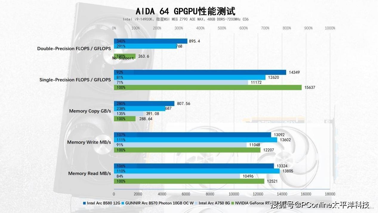 在AIDA64的GPGPU测试环节中,GUNNIR Intel Arc B570 Photon 10G W显卡展现了不俗的性能,得益于Xe2架构,其在显存性能和双精度浮点运算方面具有明显优势。然而,与Arc B580显卡相比,其显存性能确实存在差距,这主要是因为其显存带宽仅为160Bit,自然在性能上有所不及。