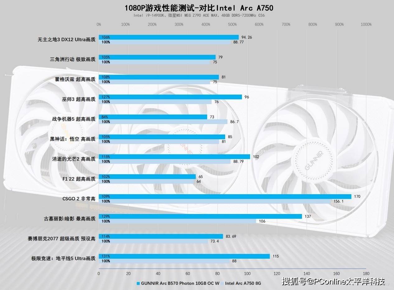 至于对比上代同定价的Arc 750显卡上,GUNNIR Intel Arc B570 Photon 10G W显卡可以说是全面领先了,部分游戏甚至已经达到了20%以上的性能领先。