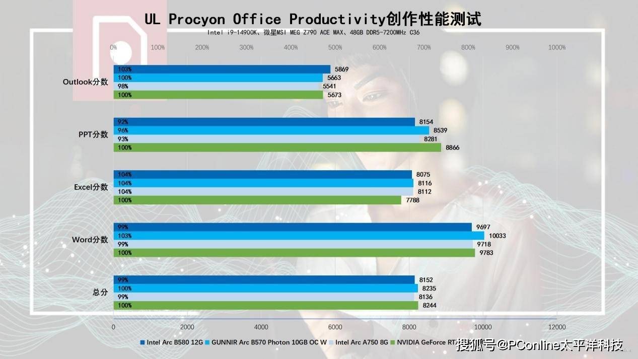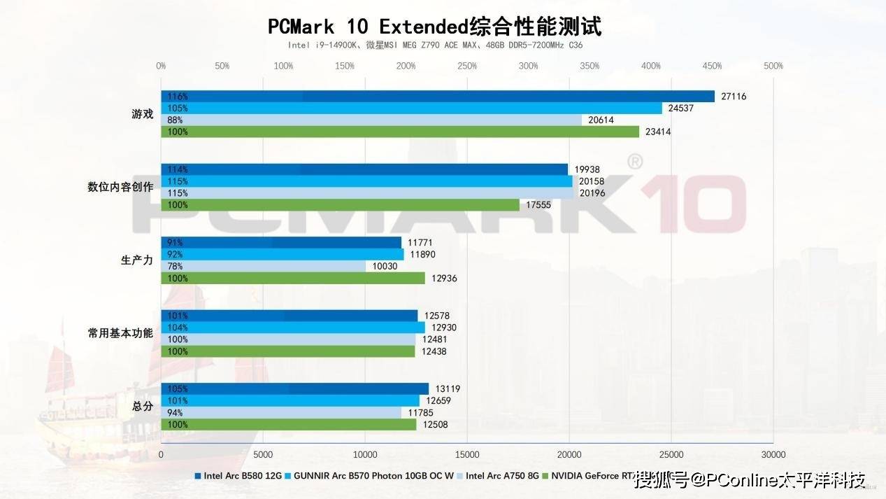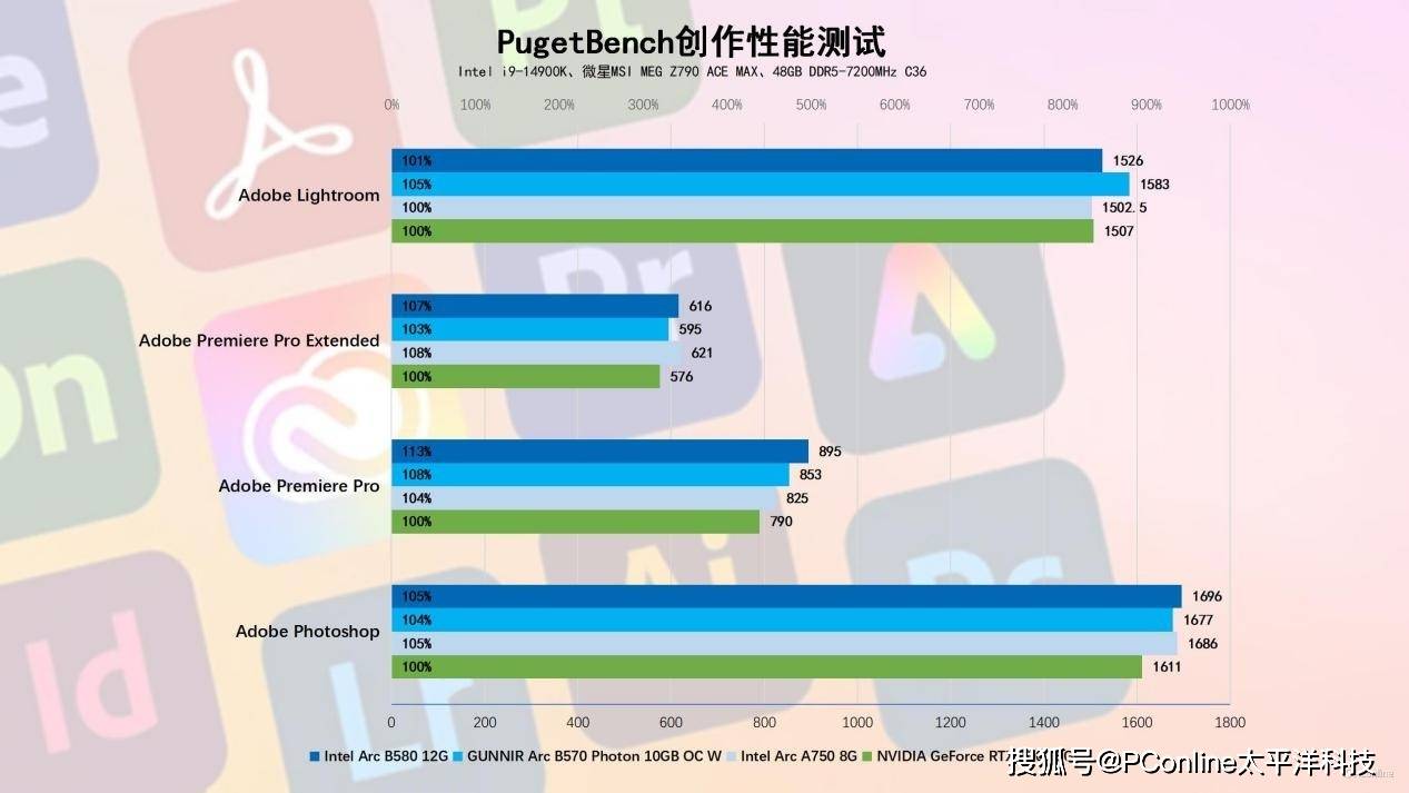 实测Intel的显卡在Adobe软件中确实是有“Buff”的,特别是在Premiere以及Photoshop两款软件中,实测GUNNIR Intel Arc B570 Photon 10G W显卡在Premiere中最大能够领先RTX 4060约8%,而Photoshop则是4%左右。