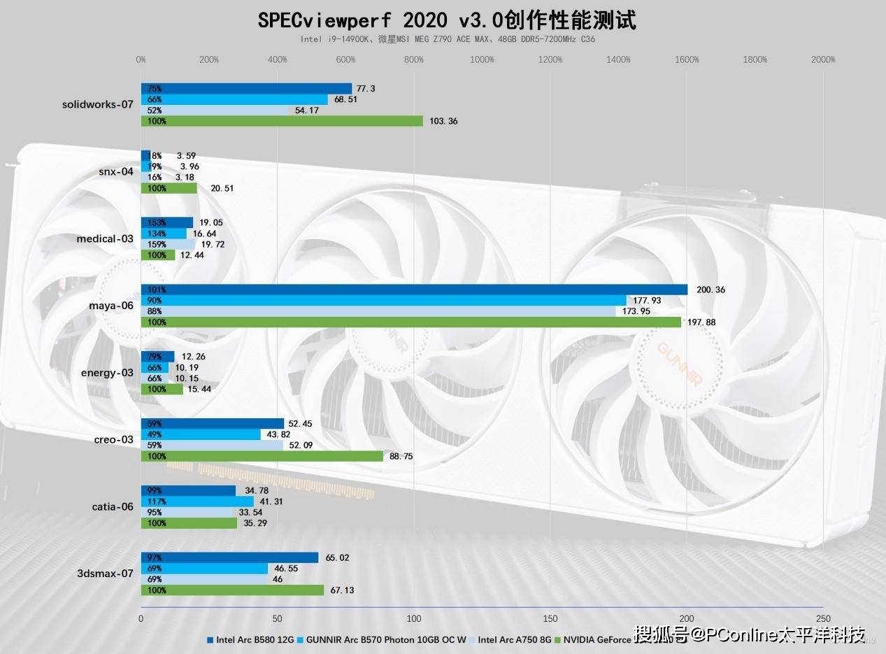 工业软件的表现只能说Intel正在一步一步地追上N卡和A卡。实测成绩如下所示,对比自己上代显卡A750则有不小的进步,部分项目的提升能够达到20%以上。