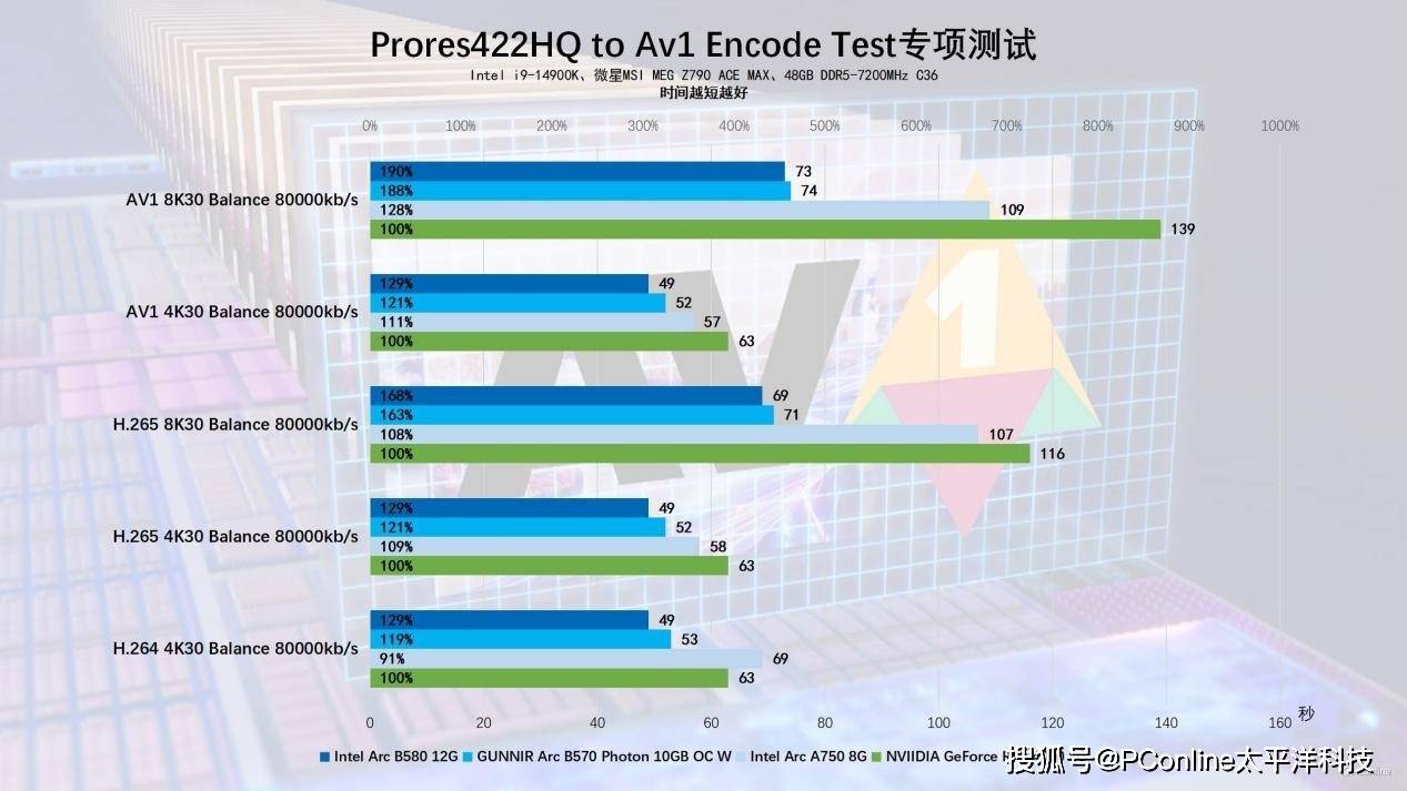 在前文中,我们探讨了这款显卡在创作方面的性能表现。然而,创作性能的提升并不仅仅依赖于软件的响应速度。对于视频制作人员而言,音频和视频的导出速度同样至关重要。自上一代产品起,Intel锐炫显卡便开始支持AV1编解码技术,而在最新一代中,这一功能得到了进一步的强化,效率显著提升。
