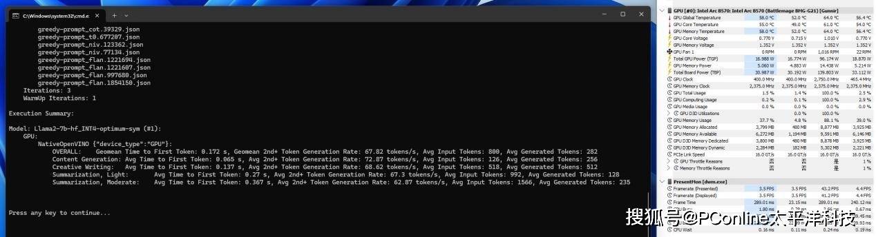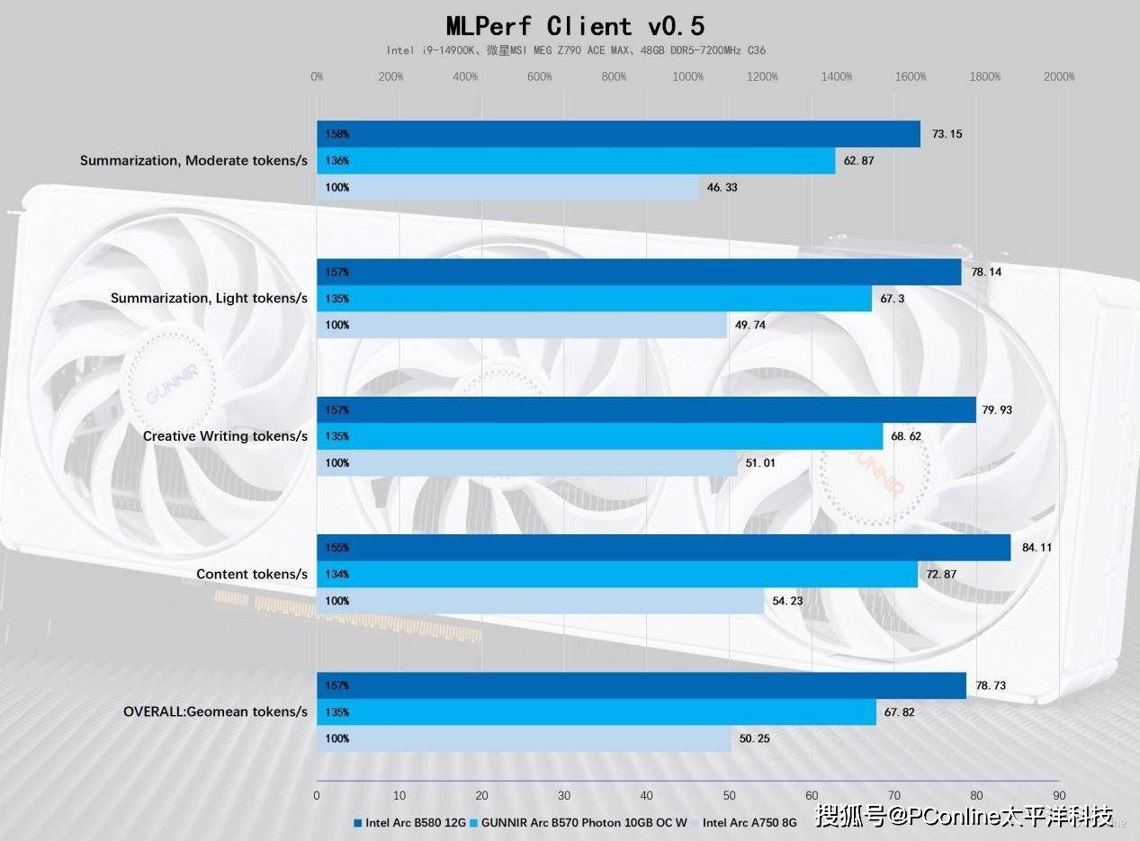 根据MLPerf Client的测试结果,GUNNIR Intel Arc B570 Photon 10G W显卡展现了卓越的AI性能。此外,10GB显存的优势在测试中也得到了体现,MLPerf Client测试期间显存最高占用达到了8878MB,这解释了为何上一代的Arc A750在性能上存在差距。