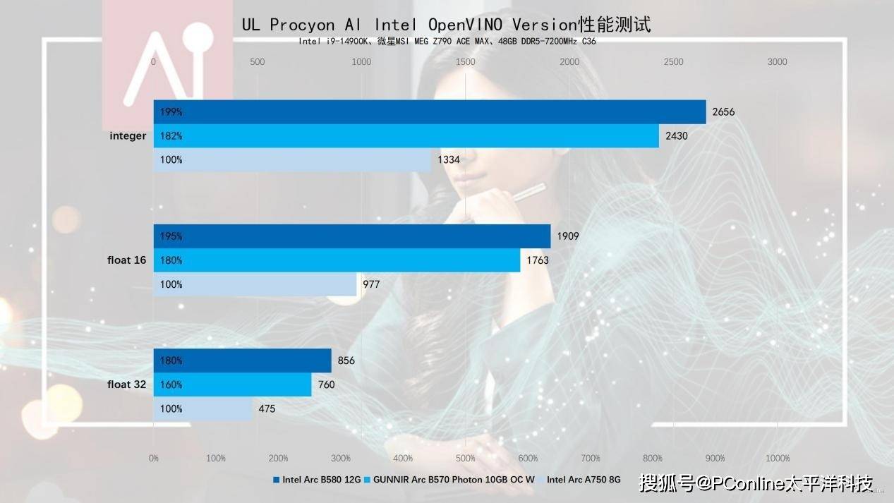 换到Intel专属的AI Intel OpenVINO Version中后,新显卡的性能更是夸张,GUNNIR Intel Arc B570 Photon 10G W显卡对比上代A750,不只是赢在显存容量上,在float32、float16以及integer计算上均遥遥领先,部分测试更是翻倍的性能提升,非常夸张!