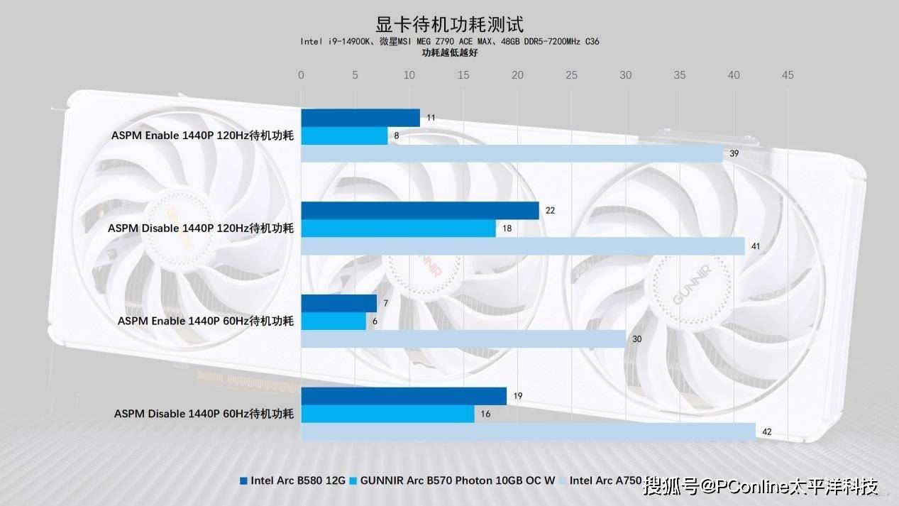 至于待机功耗上,这一代的Arc B5*0系列显卡都是超猛的,在开启主板的ASPM功能的情况下,GUNNIR Intel Arc B570 Photon 10G W显卡在2K@120Hz下的待机功耗仅有8W。如果你是2K@60Hz的屏幕,那待机功耗还可以进一步降低至6W,非常夸张。