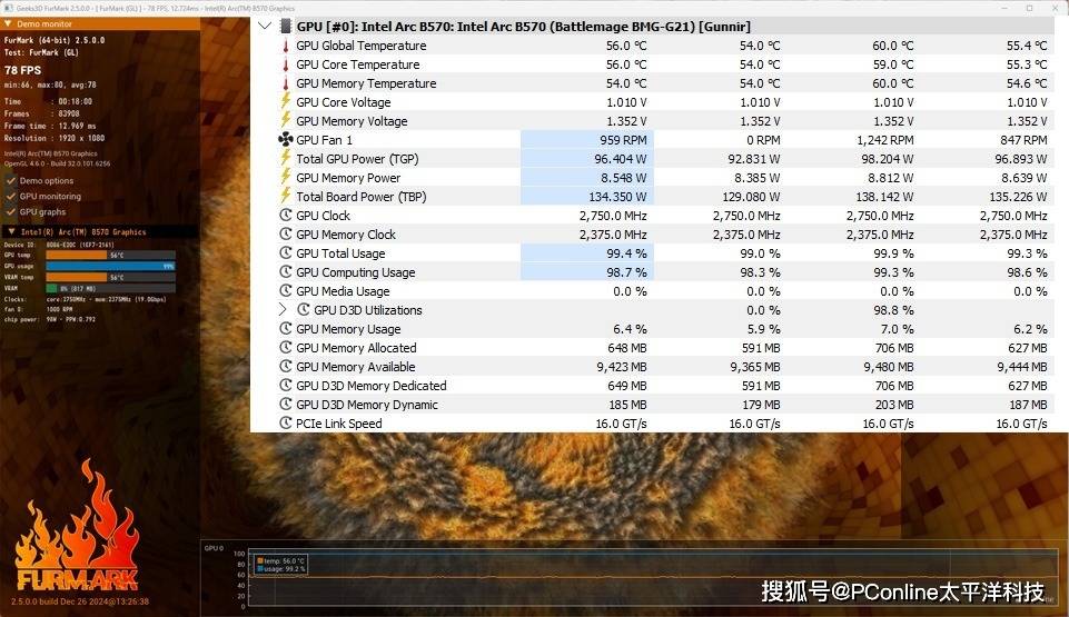 用Furmark2甜甜圈进行实测,单烤15分钟以上左右,此时GUNNIR Intel Arc B570 Photon 10G W显卡的核心频率一直跑在2750MHz的高频下,GPU功率为134W左右。温度表现也相当可圈可点,得益于升级了更新的架构以及更先进的制程工艺,实测烤机时核心仅56℃,显存54℃,超级凉快了,并且风扇转速低至959RPM,几乎听不到任何噪声。