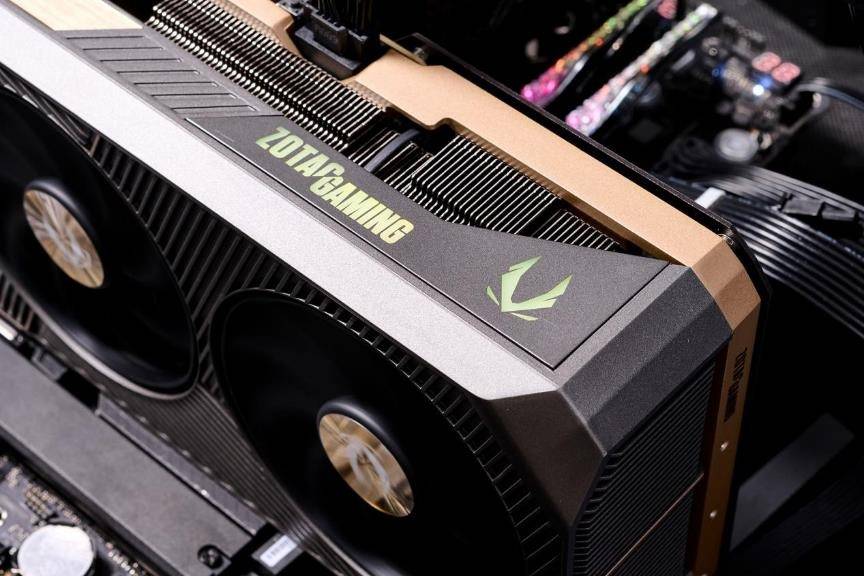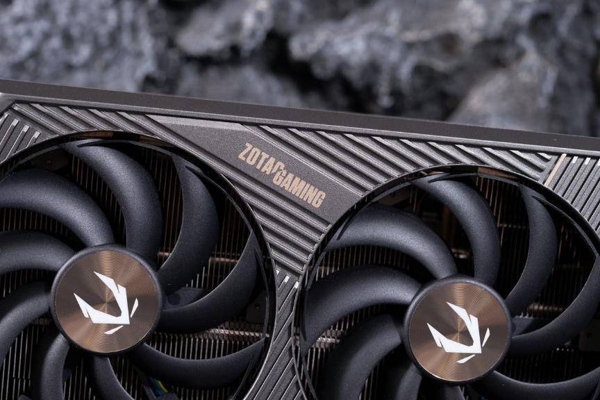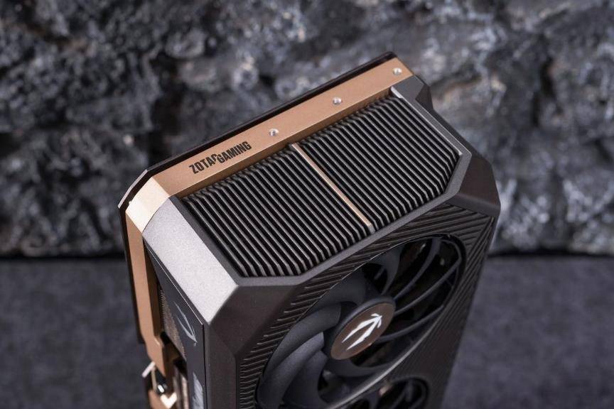 移到显卡的末端会发现,索泰依然留下了一些设计巧思,香槟金色框上印有ZOTAC GAMING的标识,栅格中央还留了一条小金线。