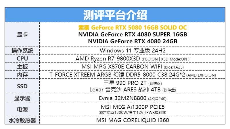 既然如此,我们直奔主题看看索泰 GeForce RTX 5080 SOLID OC的游戏表现吧,我相信这也是大多数小伙伴点进这篇评测想最先知道的内容。开始分享数据前先介绍一下咱们的测试平台配置:我们采用了曾被誉为“让RTX 4090成为瓶颈”的当代游戏神U——锐龙7 9800X3D,与之搭配的是微星高端主板MSI MPG X870E CARBON Wi-Fi暗黑,以及T-FORCE XTREEM ARGB 幻镜 DDR5-8000 C38 24GB*2,这套平台的性能理应能将索泰 RTX 5080 SOLID OC的游戏性能完全发挥出来。