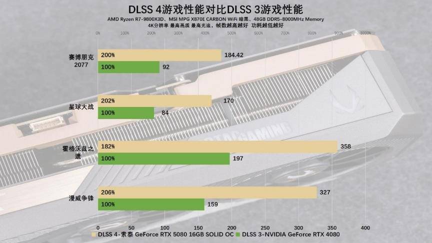 对比的对象是4款目前已支持DLSS 4的游戏,根据表格数据就能发现,有了DLSS 4加持后,索泰GeForce RTX 5080 SOLID OC的帧率几乎翻倍于DLSS 3加持的RTX 4080,这恐怖的游戏实力正是AI融入游戏技术的最佳范例。