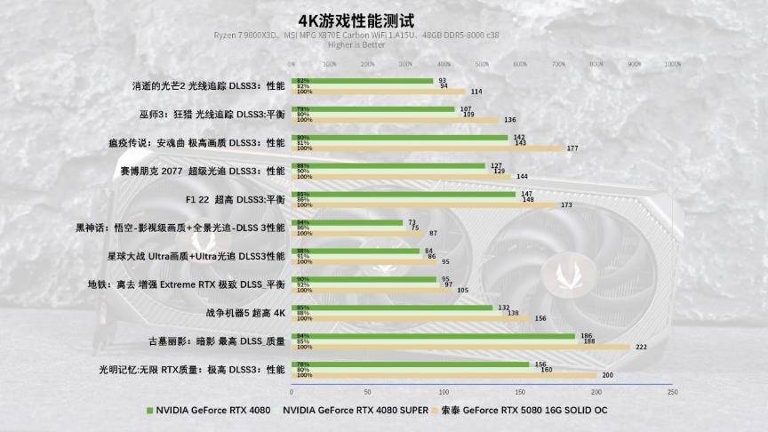 在不借助DLSS 4的状态下,实测索泰GeForce RTX 5080 SOLID OC比RTX 4080 SUPER强8%~25%,所有这些3A游戏的平均帧率均在60FPS以上。